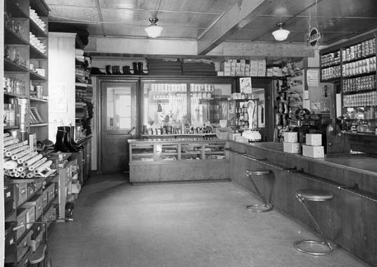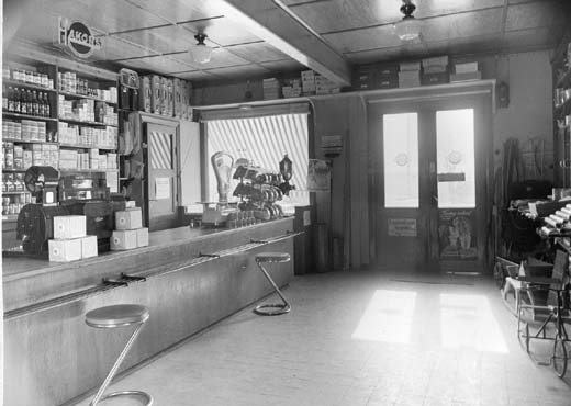 … Innanför dörren slår en lukt av kryddor, saltlake, lut och svett jämte åtskilligt annat oidentifierbart emot en. Golvet i butiken är täckt av sågspån, i taket hänger allehanda prylar: hinkar, remtyg, redskap och guvet allt. Så som det ser ut i Vik-tor Jonssons handelsbod, så ska det se ut i en riktig lanthandel på ti-digt nittonhundratal. Bakom disken står handlaren själv med skärmmössa och en penna bakom örat, lite korpulent och sannerligen mycket fryntlig. Ett blått förklä täcker den runda magen. Ögonen far raskt runt och möter de inträdande, som han alla känner väl. Biträdet herr Melin finns också på plats, och båda har mycket att göra med att väga upp mjöl och gryn och annat som gårdskuskarna har fått förtroendet att handla åt folket på de olika gårdarna. Färdigpackade ligger redan många paket med alla möjliga förnödenheter, som godsägarn själv eller hans fru har ringt in beställning på. För i Jonssons butik finns inte mindre än två telefoner: dels s k Allmänna telefon med nummer Bro 7 och så Rikstelefon som har Säbyholm som växelstation, Jons-sons nummer är Säbyholm 14. Telefonerna står inne på kontoret på en hög pulpet. Där sitter alltid Viktor Jonsson och för räkenskaper, när han inte expedierar kunder eller vistas ute på det väldiga magasinet. Eller kör ut varor. För det gör han också ofta. Han har en motorcykel av mär-ket Harley Davidson med sidovagn, som rymmer mycket.
