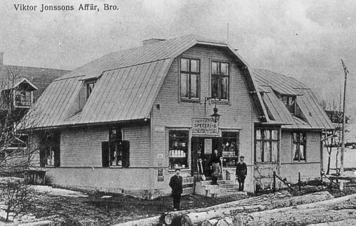 Men för Viktor Jonsson går allt bra. Det är inte illa att vara "hovleverantör" till grevliga slott och stora herrgårdar. Därtill har han prästgården som kund, vilket åtminstone sommartid, är värdefullt, för då har prästfolket alltid ett tjugotal sommarkonfirmander inackorderade, och dessa ungdomar har god aptit. Alla inköp sam kyrkoherdens gör skrivs upp i en "motbok” och betalas i efterskott, alltså när konfirmanderna har rest hem. Då brukar kyrkoherden själv gå ner till handelsboden och göra upp med handlaren, som, när han kvitterar betalningen, alltid bjuder på en stor cigarr. För rättvisans skull har kyrkordens konto även hos Emil Boije, där dock köpesummorna aldrig blir så stora. Men dorn räcker för att Boije i sin tur också visar någon erkänsla, i allmänhet i form av en stor påse godsaker. Att handla hos Viktor Jonsson är alltid lika roligt. Det finns så många varor i hans butik och han har alltid ett vänligt eller skämtsamt ord att komma med. Faktum är, att han är en mycket slagfärdig man, som ald-rig blir svarslös. Eftersom han fått rykte om sig att göra allt för sina kunder, att lyssna till kundens önskemål och raskt ta hem de ting som kanske inte råkar finnas i lager, så finns det dem som tycker det kan vara lockande att sätta honom på prov. Detta gällde t ex den för sina humoristiska infall kände bokförläggaren Folke Lars Hökerberg, som ofta gästade goda vänner i Bro. En dag trädde han in i Viktor Jonssons handelsbod, och med en glimt i ögat frågade han, om det var sant att handlaren kunde tillfredsställa alla sina kunders önskningar. Jojomän, svarade Viktor Jonsson, vad önskar bokförläggaren? - Jo, sade Hökerberg, jag vill beställa en elefant. Går det för sig? - Visst, det ska bli, svarade Viktor Jonsson, ska det vara en vit eller en grå? Den gången var det bokförläggaren som blev svarslös. På 1930-talet moderniseras butiken och hela huset. Bilderna togs strax efter ombyggnaden. |